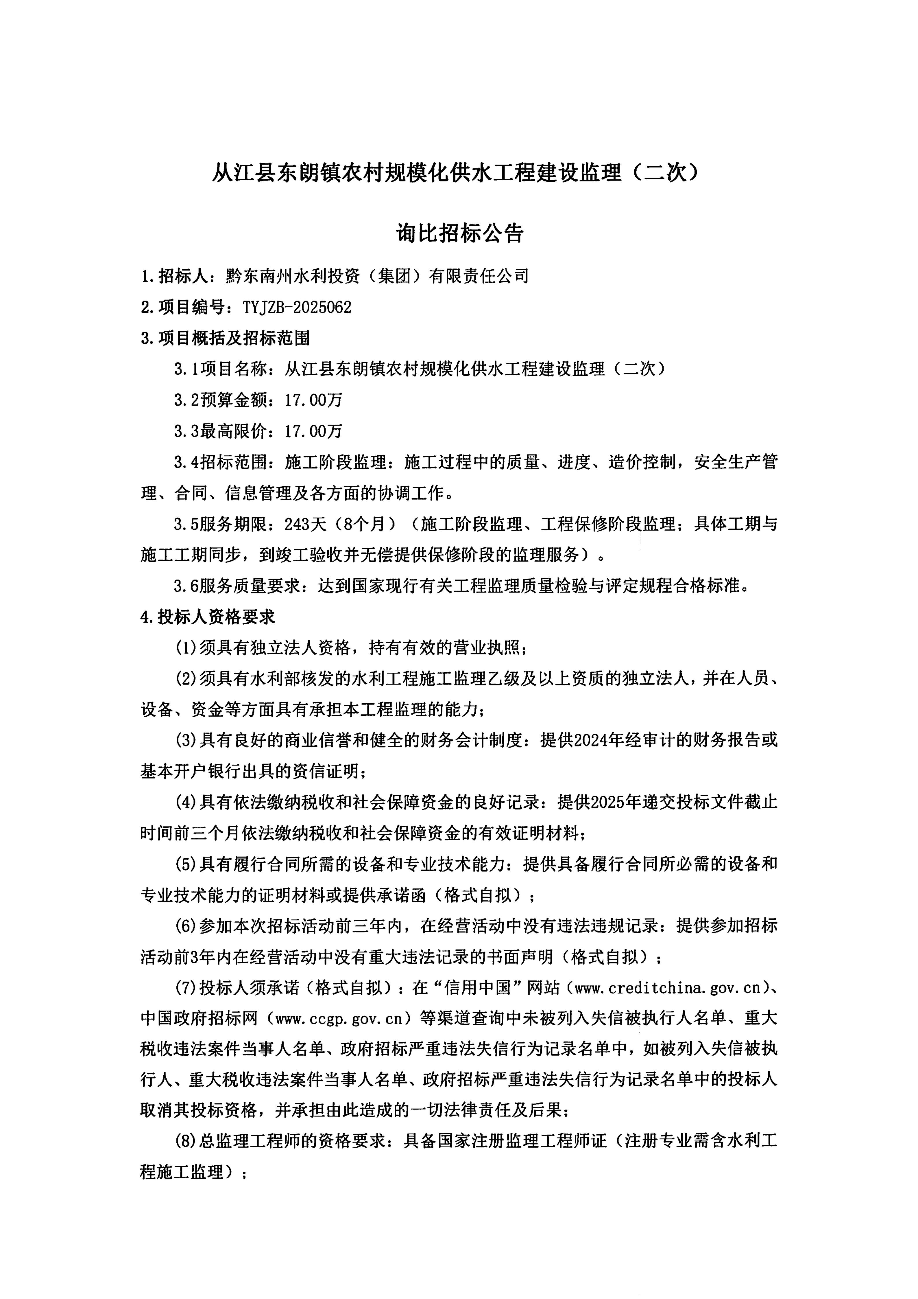 从江县东朗镇农村规模化供水工程建设监理(二次)询比招标公告