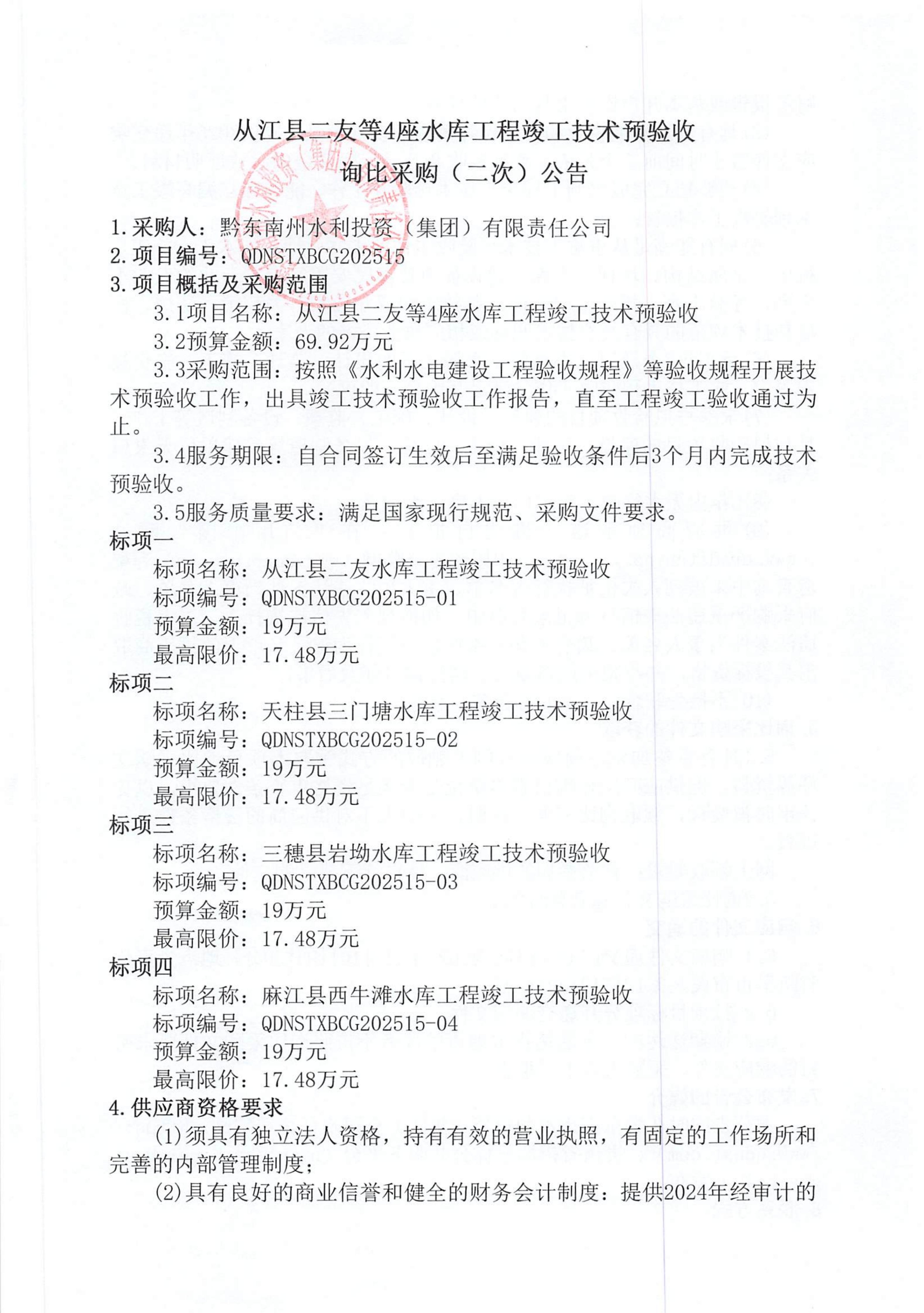 从江县二友等4座水库工程竣工技术预验收询比采购(二次)公告