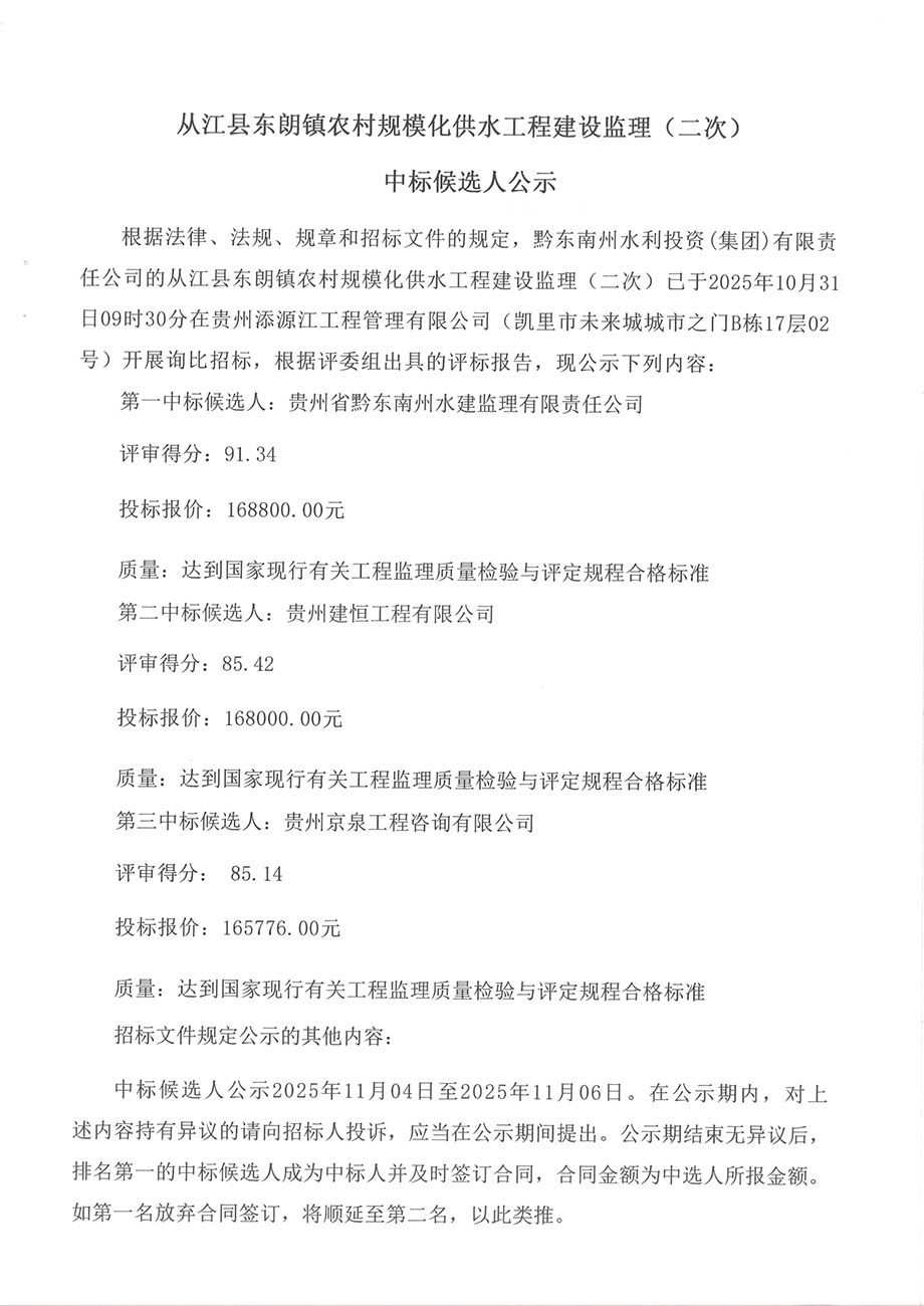 从江县东朗镇农村规模化供水工程建设监理(二次)中标候选人公示